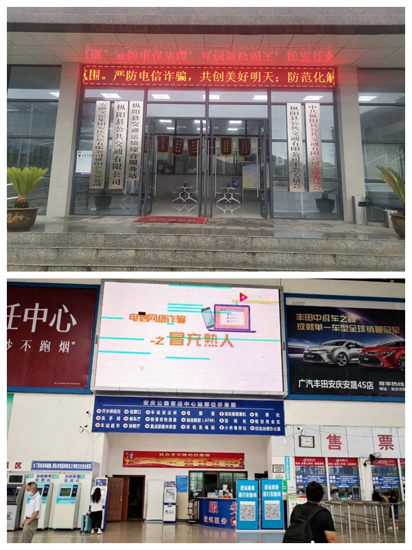 為進(jìn)一步加強打擊治理電信網(wǎng)絡(luò )詐騙犯罪,切實(shí)提升人民群眾防范意識和法律觀(guān)念,有效遏制電信網(wǎng)絡(luò )詐騙犯罪的發(fā)生,2021年5月15日至2021年6月15日,安慶公路客運中心站開(kāi)展“防范電信網(wǎng)絡(luò )詐騙犯罪集中宣傳月”活動(dòng),活動(dòng)期間車(chē)站利用站內電子顯示屏投放多條公益廣告,發(fā)布防范和打擊電信網(wǎng)絡(luò )詐騙的相關(guān)宣傳內容和信息。宣傳片引得旅客及司乘人員紛紛駐足觀(guān)看學(xué)習,切實(shí)營(yíng)造了宣傳氛圍,提高了群眾防騙意識和能力。
