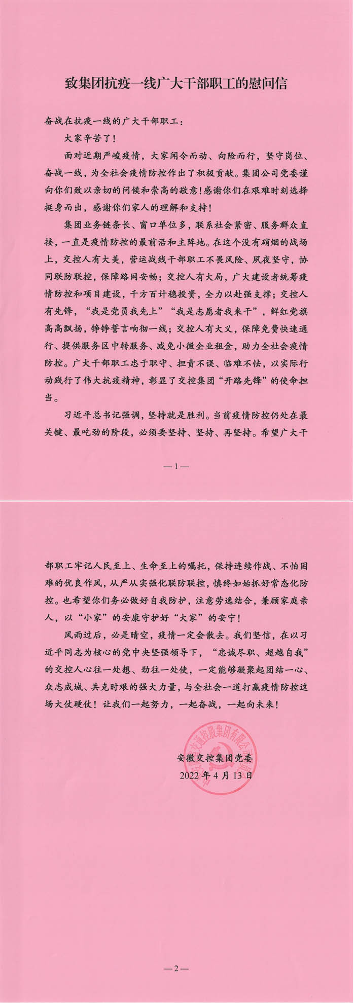 致集團抗疫一線(xiàn)廣大干部職工的慰問(wèn)信