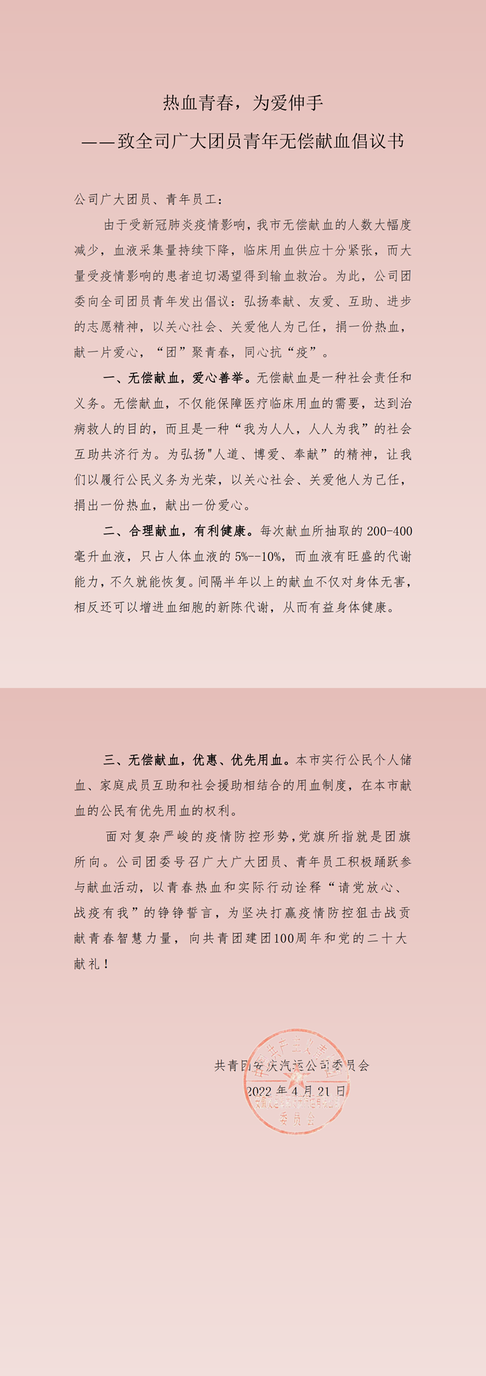 致全司廣大團員青年無(wú)償獻血倡議書(shū)